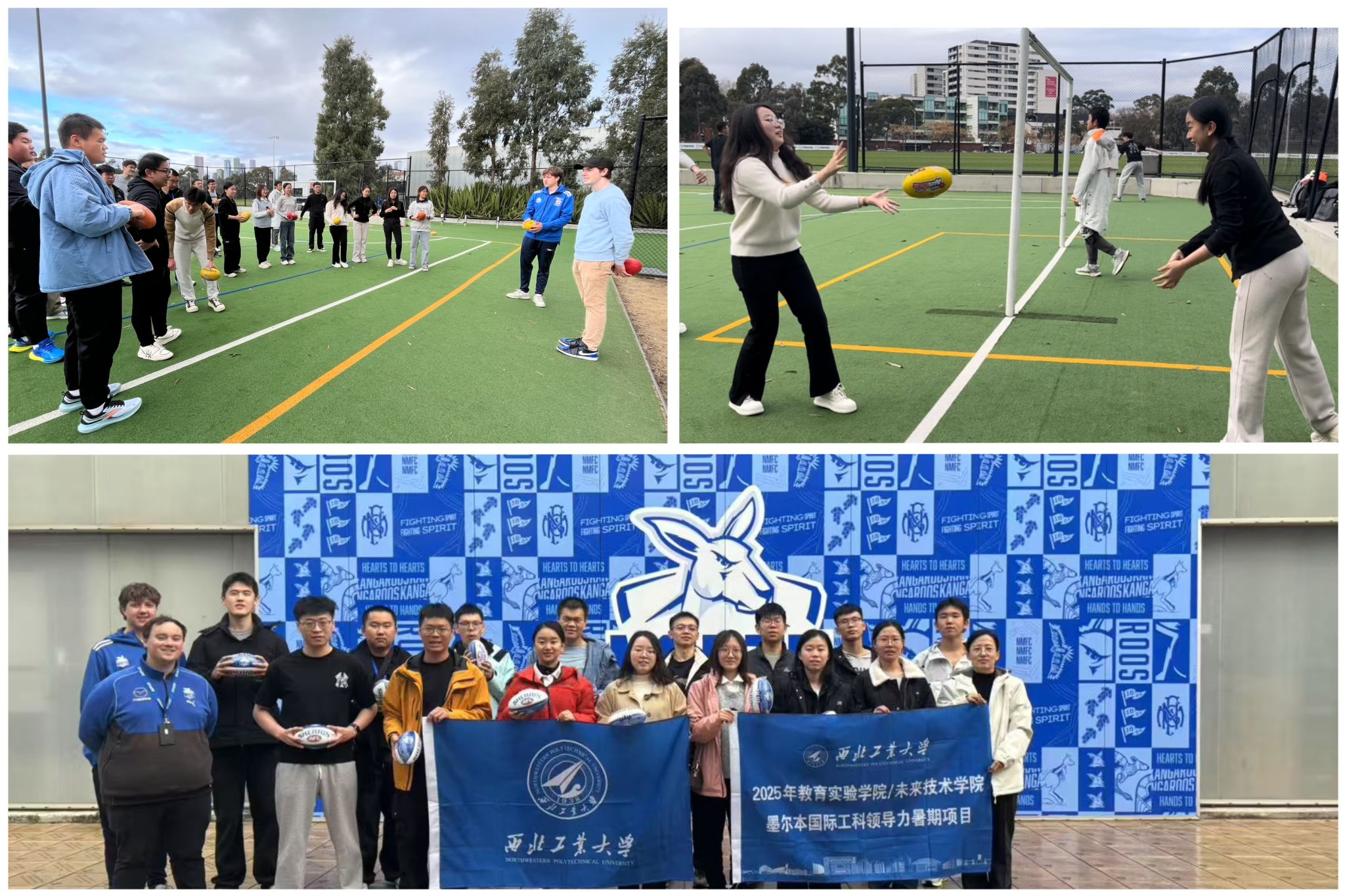 学习之余,同学们也游历了墨尔本的城市风貌。走进墨尔本博物馆,了解了澳大利亚社会历史、原住民文化、科学发展及环境。在墨尔本美术馆,仿佛置身于艺术的长河之中。在墨尔本CBD感受了城市的繁华,沿着大洋路西行,欣赏了波涛汹涌大海中的十二门徒岩和伦敦拱桥。在AFL基地,同学们与北墨尔本袋鼠队的队员和教练进行了密切交流,亲身体验了澳式足球的玩法,对澳洲体育文化有了更深入的了解。