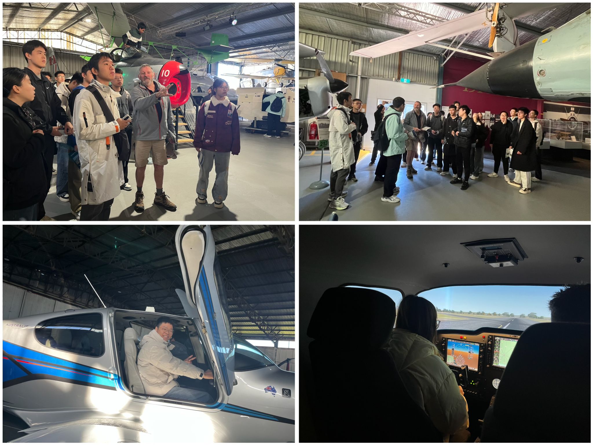 穆拉宾机场是澳大利亚的民用飞行训练机场。机场的工程师为同学们讲解了飞机引擎的结构、各个部件的功能和原理等航空知识。在这里,同学们近距离接触驾驶舱,了解飞机基本操作,在逼真的模拟座舱亲自操作,体验了从起飞到降落的整个过程。