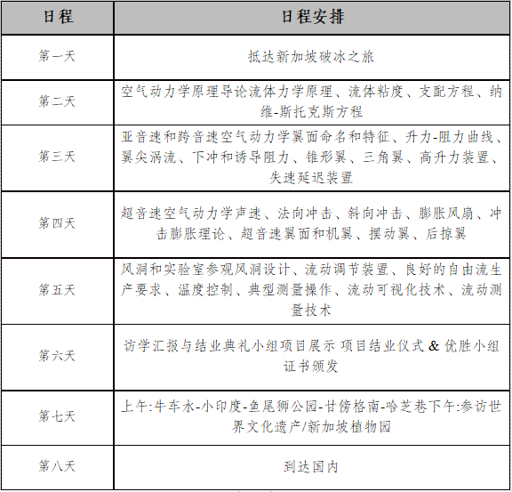 本项目由南洋理工大学在职教授授课,项目包括空气动力学与流体力学、亚音速和跨音速空气动力学、风洞和实验室参访、高升力装置与测量操作等相关主题内容,涵盖新加坡南洋理工大学特色专业课、小组讨论、结业项目展示等内容,最大程度让员工在短时间内体验南洋理工大学的学术特色,强化学科认知,拓展学术视野。