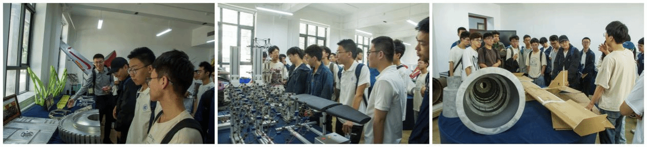 随后,全体师生实地观摩团队研究成果。在团队研究生代表的引导讲解下,展厅内陈列着与报告内容紧密关联的实物模型,包括团队研发的拓扑优化精密工件、采用创新切削工艺的航空部件原型,以及最新月壤增材制造试验样本。现场还同步展出了由员工自主设计的轻量化纸板航空无人机等创意作品。