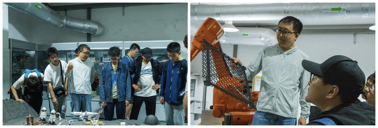 师生们近距离参观了科研团队的实验室核心区域。在精密仪器环绕的开放式空间内,讲解人员逐一解析多轴增材制造设备、多材料复合3D打印系统、高精度动态力学测试平台、结构性能评估仪器等装置的功能。实验室内陈列的力学研究模型、纤维复合材料成型工件等工具,直观呈现了理论研究向工程实践的转化路径。