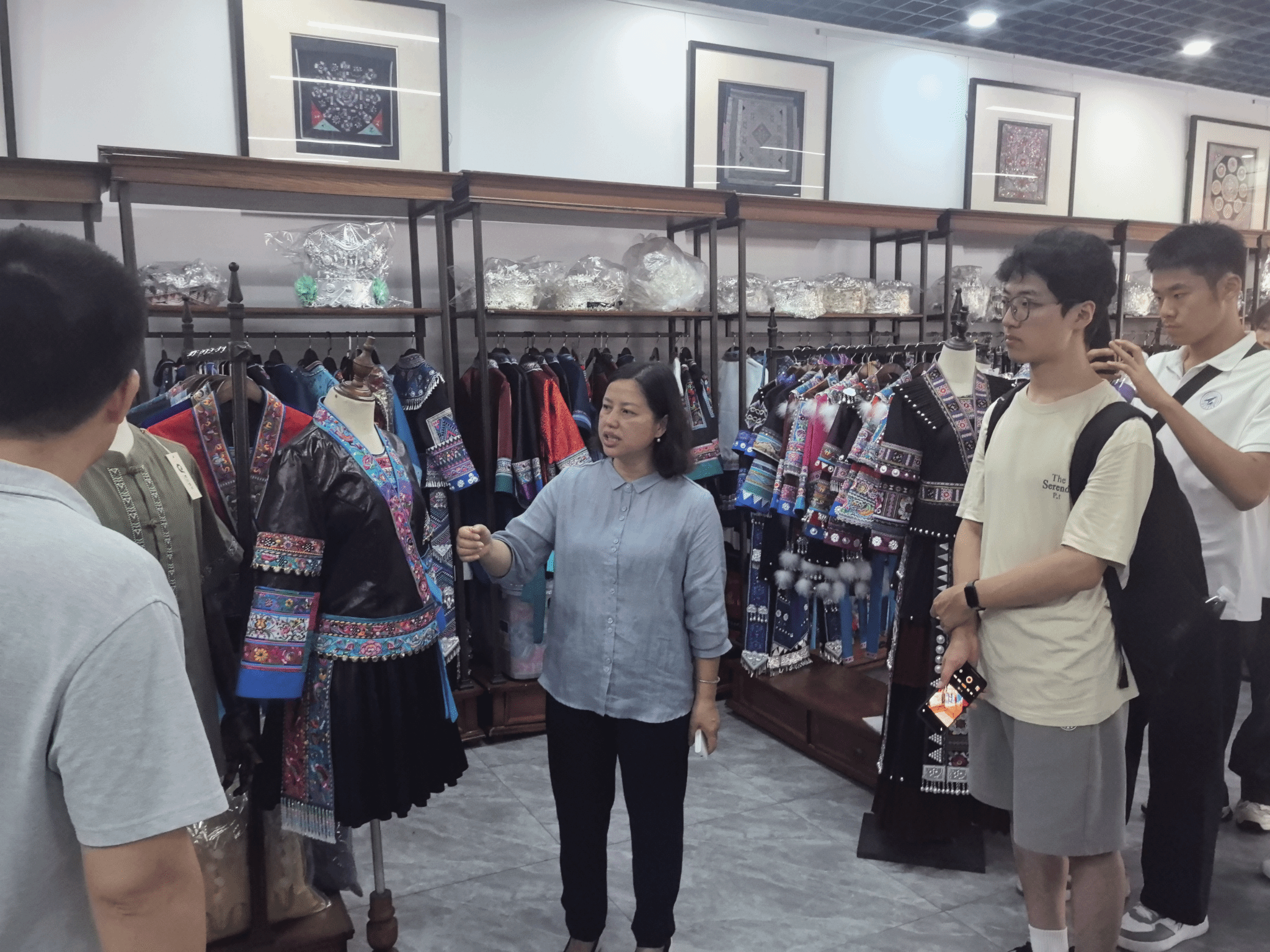 在苗族刺绣非遗传承馆,实践队跟随李伊园老师深入了解苗绣传承现状。以亮布为例,队员们见识了苗绣工艺的复杂与耗时;欣赏百鸟衣时,大家被其精致华丽所折服,纷纷赞不绝口。李老师讲述的苗绣传承困境与未来规划,让队员们感受到非遗传承的艰辛。