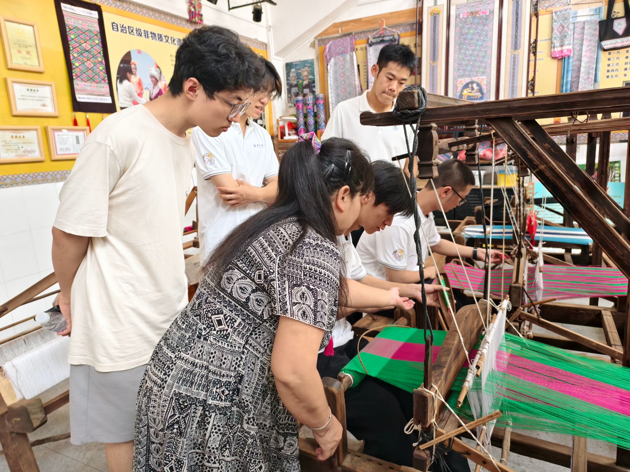 随后,队员们拜访了苗锦第四代传承人唐巧英老师,体验“寸锦寸金”的技艺。在唐老师带领下,队员们实际体验纺织,从手忙脚乱到愈发从容,切实感受到了在这个快节奏的时代,纯手工技艺带给心灵的不仅是一份艺术,更是一份时间铸成的醇厚。队员们与传承人探讨非遗传承路径,对非遗传承人的匠心精神深感敬佩,提出“影视记录 + 文创赛事 + 短视频传播”的方案,期待通过实际行动为非遗传承注入新活力。