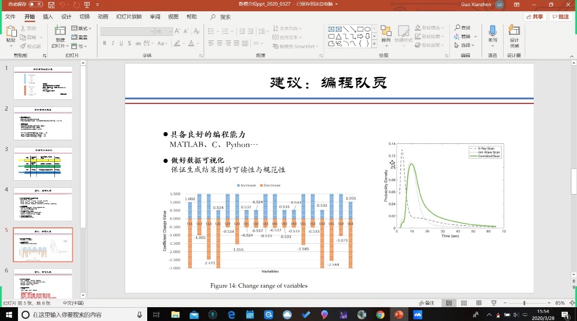 接下来,郭宪振同学详细地介绍了数学建模的流程,从选题到论文的提交,介绍了自己和队友的时间规划和分工,并分别给建模队员、编程队员、写作队员提出了几点中肯实用的建议。还对如何备战数学建模给出了一些心得,包括工具书、编程软件,以及队友的选择。特别强调了数学建模过程中的心态,建模过程中不管遇到什么困难都要及时调整心态,一个好的心态是完成比赛的关键。