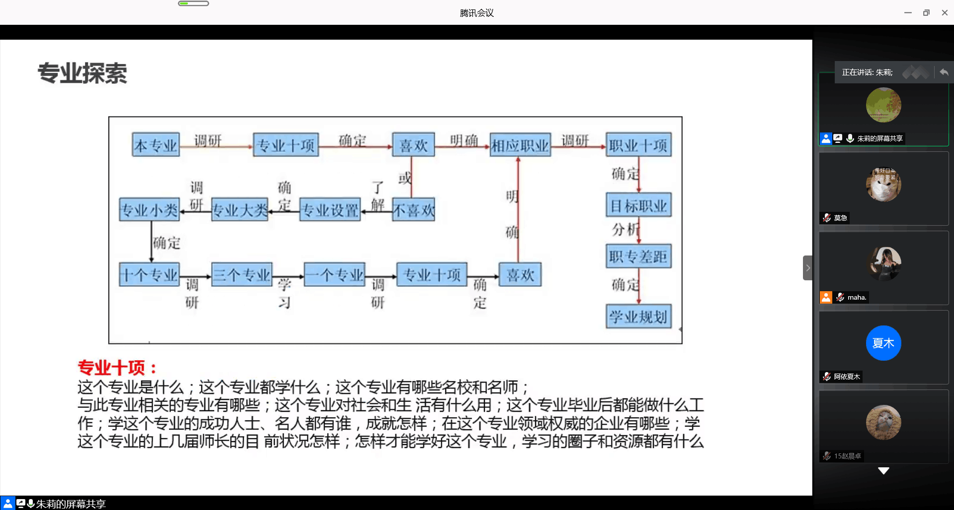 在互动提问环节,赵晨卓同学问道:“应从什么途径具体去了解各专业?”朱莉老师细心的为同学们分享了专业探索的步骤,并推荐同学们观看“空天地海,西工大带你遨游”学科专业讲堂。保雪同学问道:“若对任何专业或职业都没有太大兴趣,未来应如何选择专业?”朱莉老师向同学们提出建议,应不断扩展自己的视野,多探索一些领域以此来发掘自身的兴趣。