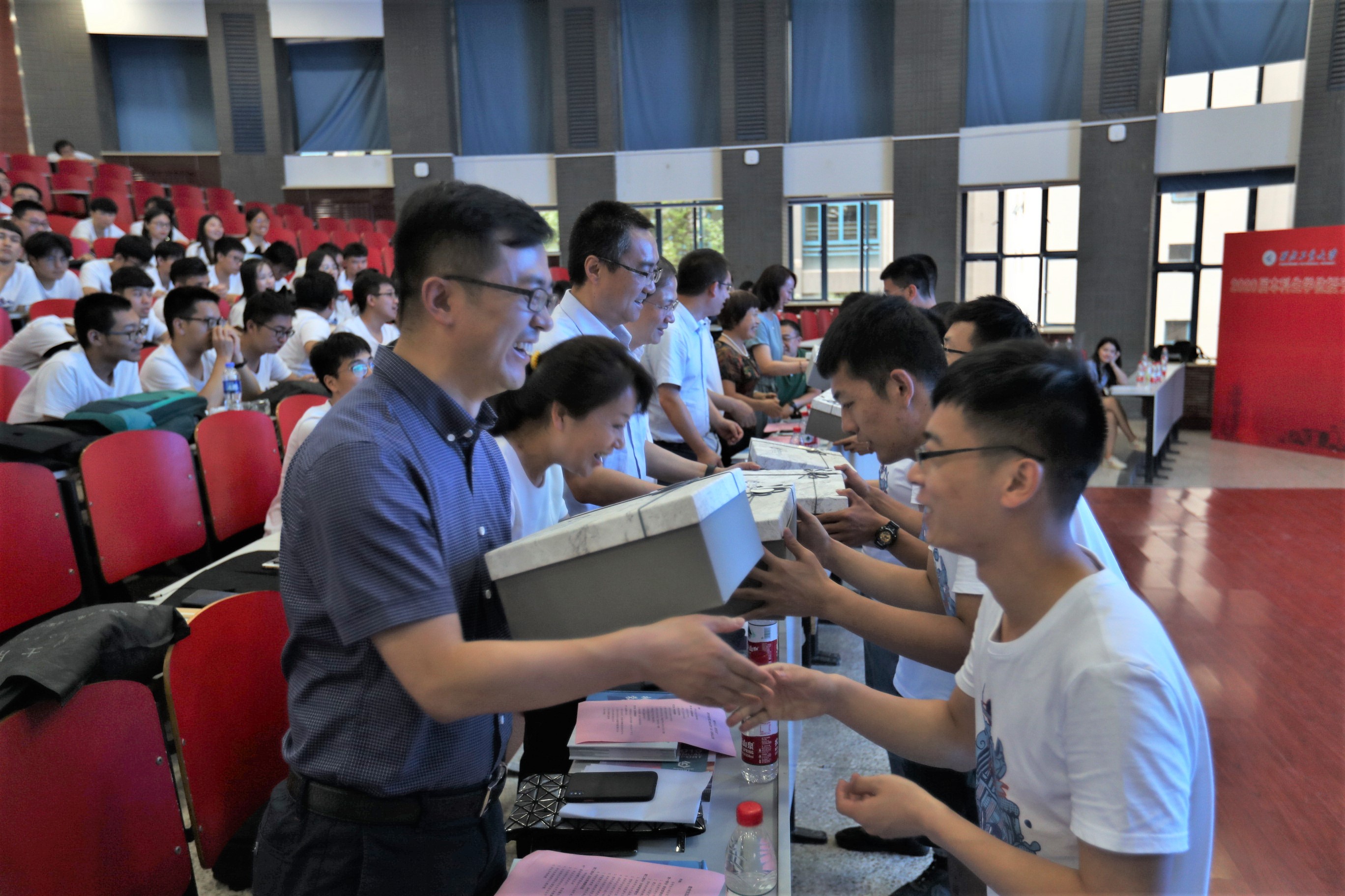 各位老师向本科毕业生代表配发荣誉院徽并赠送公司原创的纪念U盘、水杯和背包。各位老师还向预科生颁发结业证书,八名优秀预科生代表上台领取了结业证书。