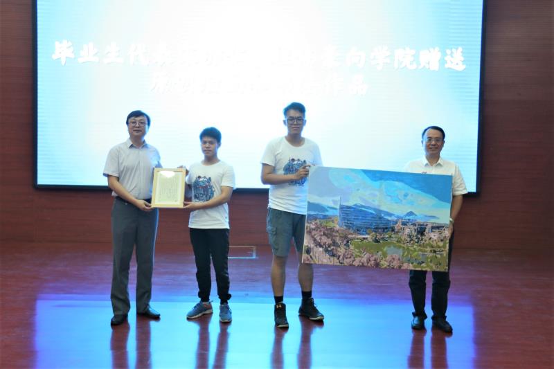 毕业生代表宋亦仁和程伟豪代表全体毕业生向公司赠送以长安校区图书馆为主题的原创绘画和书法作品,以感谢公司的培育之恩。