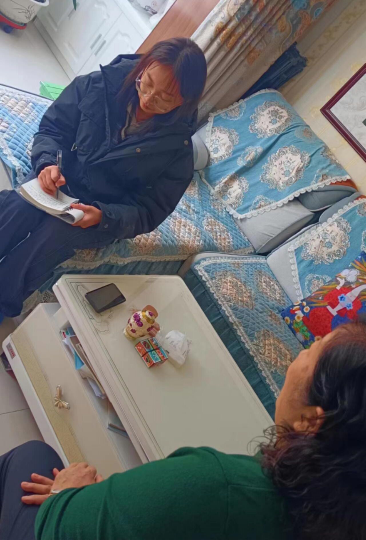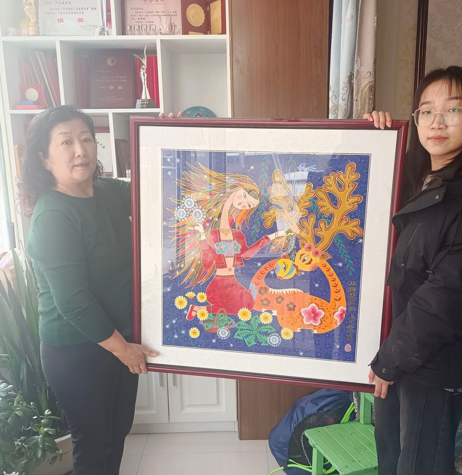 为更加深入了解桦甸农民画,实践团队的成员们特地采访了桦甸农民画非遗传承人卢凤霞女士。卢凤霞女士受母亲熏陶从小就对刺绣、画画感兴趣,因高考失利与自己理想的美院擦肩而过,后又经父母安排嫁到靖宇县的一个小山村里。