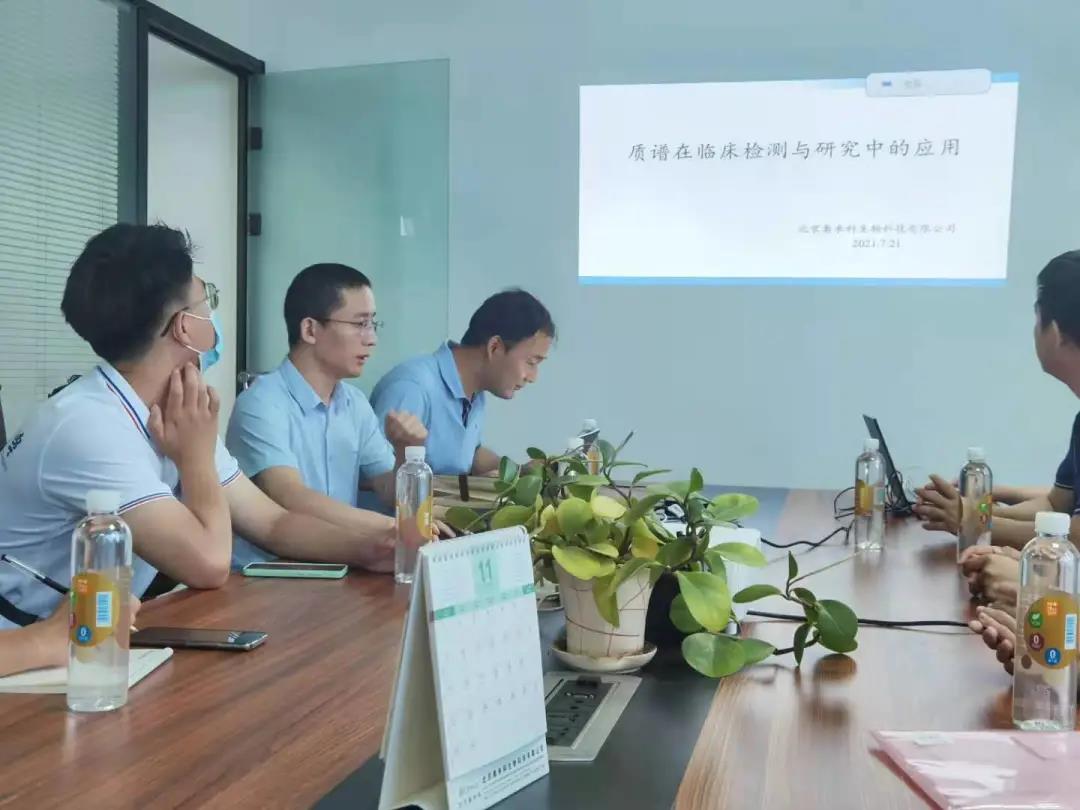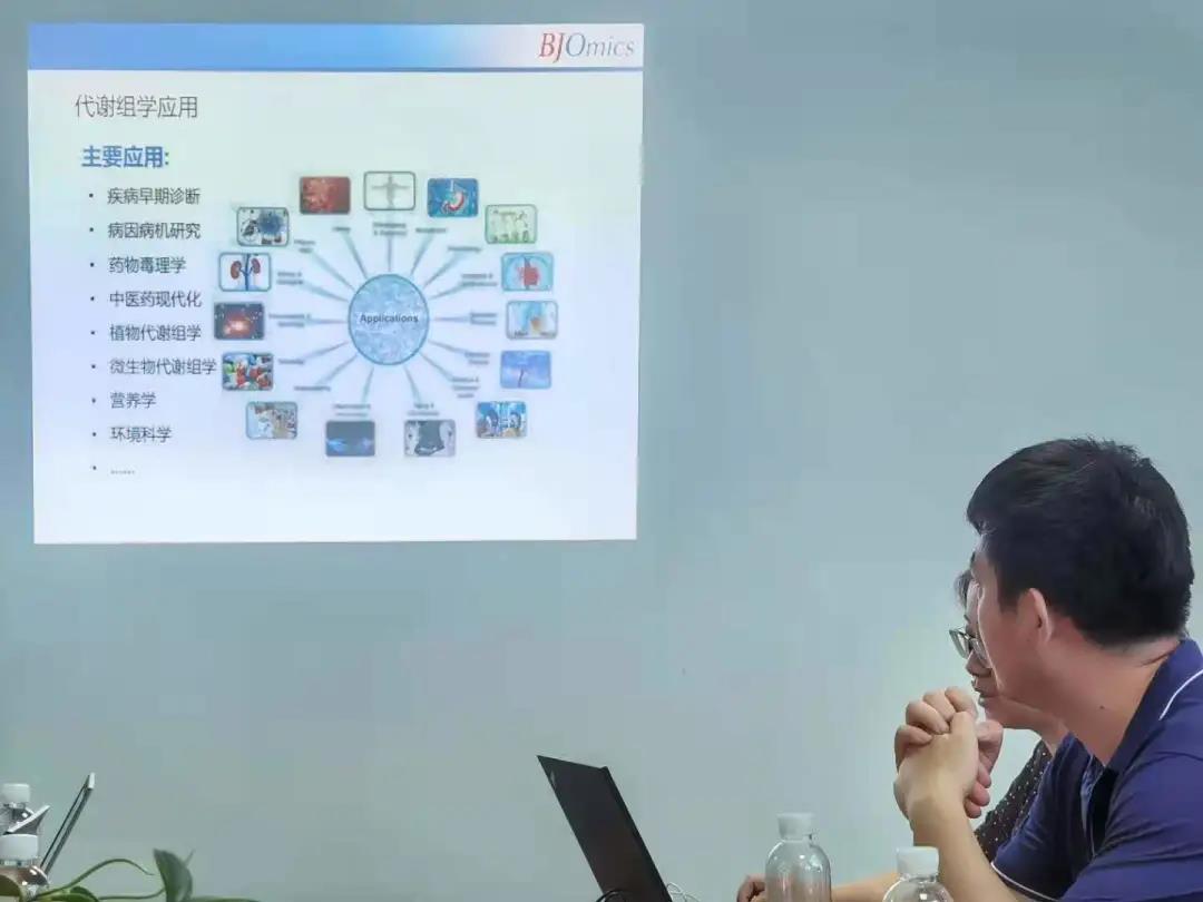 首先,奥米科生物科技有限公司的研究人员为实践队介绍了质谱检测在临床中的应用与代谢组学的研究。液相与液质的检测的质谱分析,能够分析到小数点后四位,定性测定相关物质,能够大大提高测量准确度;而基于质谱分析的的代谢组学分析,通过分析细胞的代谢物,来判断生物个体的健康状况,也为实践队的基于基因的研究方向提供了借鉴与思路。
