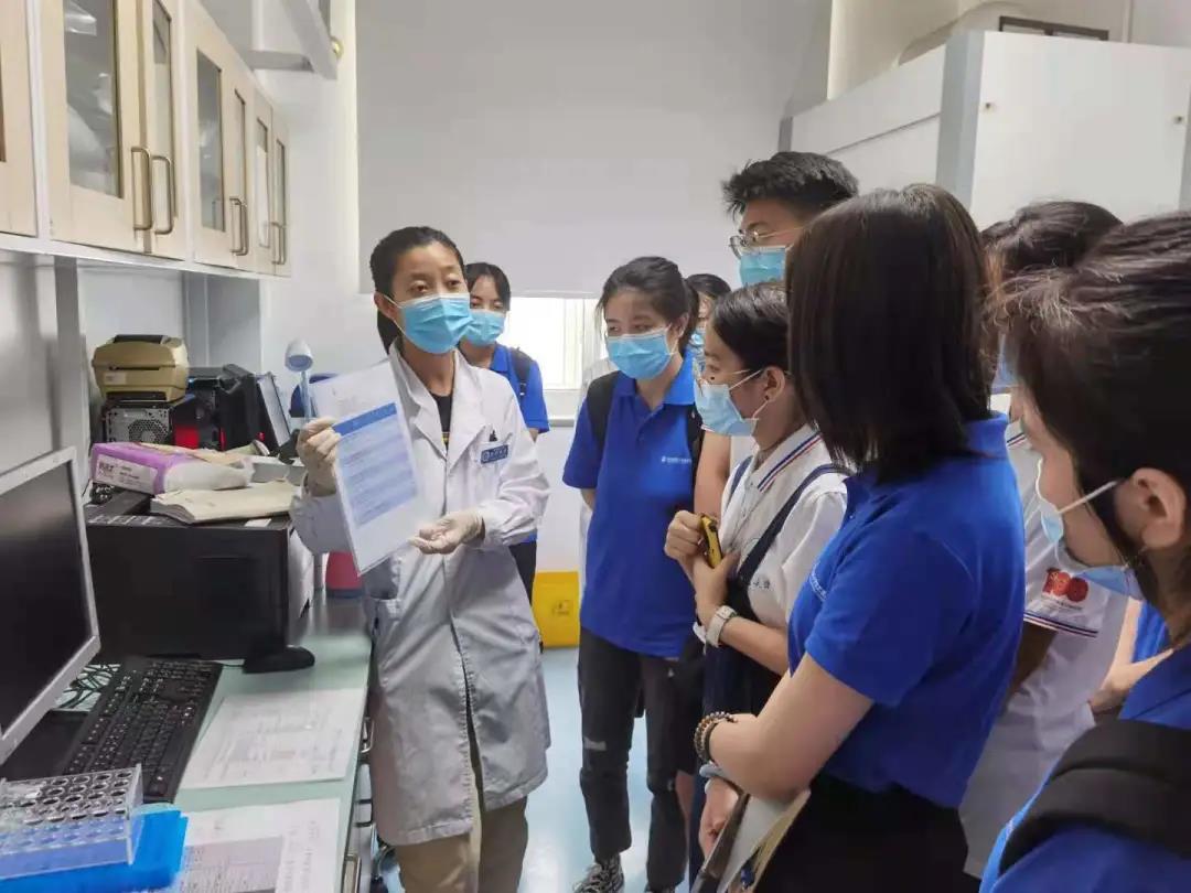 现代科学的发展离不开实验的支撑,在介绍完神经免疫中心的研究内容后,刘海杰医师带领实践队的队员们前往实验室进行实地参观。在流式细胞实验室,队员们为高通量的细胞的检测分析所吸引,并与研究人员对其功能进行探讨;在基因与蛋白分析实验室,队员们被研究人员熟练而精细的操作所折服,并就基因测序、研究工作等方面进行探讨;在样本冷藏室,队员们听取了医师深入浅出的讲解,并对实验样本的采集、储存等产生浓厚兴趣。