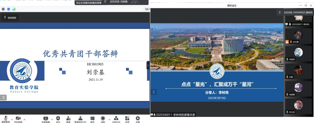 HC001902、HC001903、HC002004、HC002006、HC002101和HC002103这6个团支部书记依次进行了先进团支部答辩,就所在团支部的思想建设、党团建设、联系服务作用、工作落实和特色活动等方面进行汇报,展示了一年来各支部充实的思想政治建设、组织生活、学习工作、社会服务、创新创业等方面的成果。