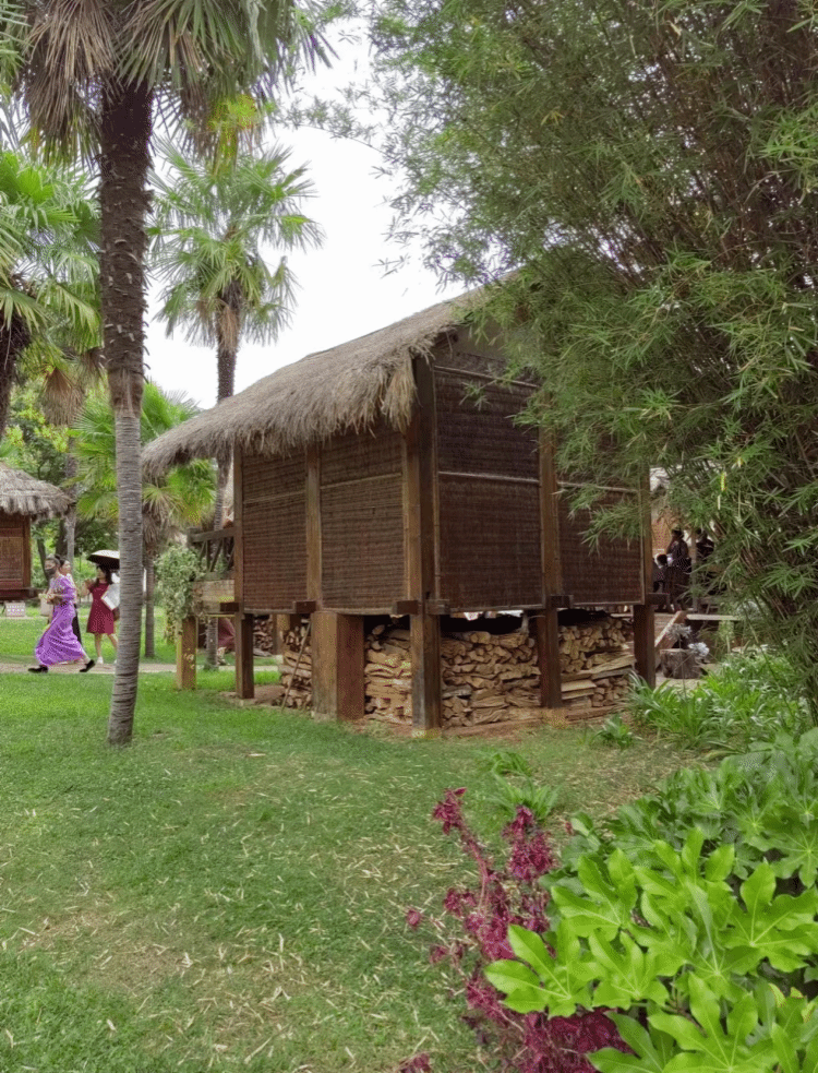 我们踏入民族村的日月广场,广场上屹立着四棵图腾柱,这是哈尼族传说中的发祥地“惹罗普楚”祖先大寨里的白塔,四棵柱子反映了哈尼族诞生建寨、保卫家园、辗转迁徙、创造梯田文化的历程。