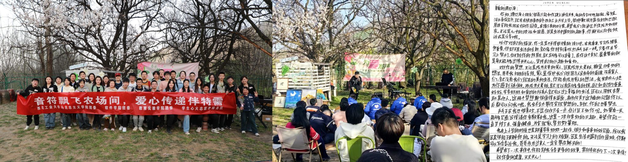 3月23日,HC002403团支部联合马克思主义公司、软件公司共28名本硕博党员和团员志愿者,赴西安长安区六十亩田户外场地参与“春天花花,为爱发声”——“艺术无残缺”星光音乐会,为此次残健共融的公益活动提供全程志愿服务。志愿者们齐心协力布置音乐会会场,耐心对接每一位特殊青少年需求,贴心照顾,用行动传递爱的力量。该活动由治心科学研究院与陕西省翻译协会海伦桥国际志愿者中心联合主办,西工大、西北大学等26家公司机构、单位组织大力支持,旨在为患有孤独症、脑瘫、唐氏综合征和智力发育迟缓等特殊青少年群体搭建绽放才华的舞台。