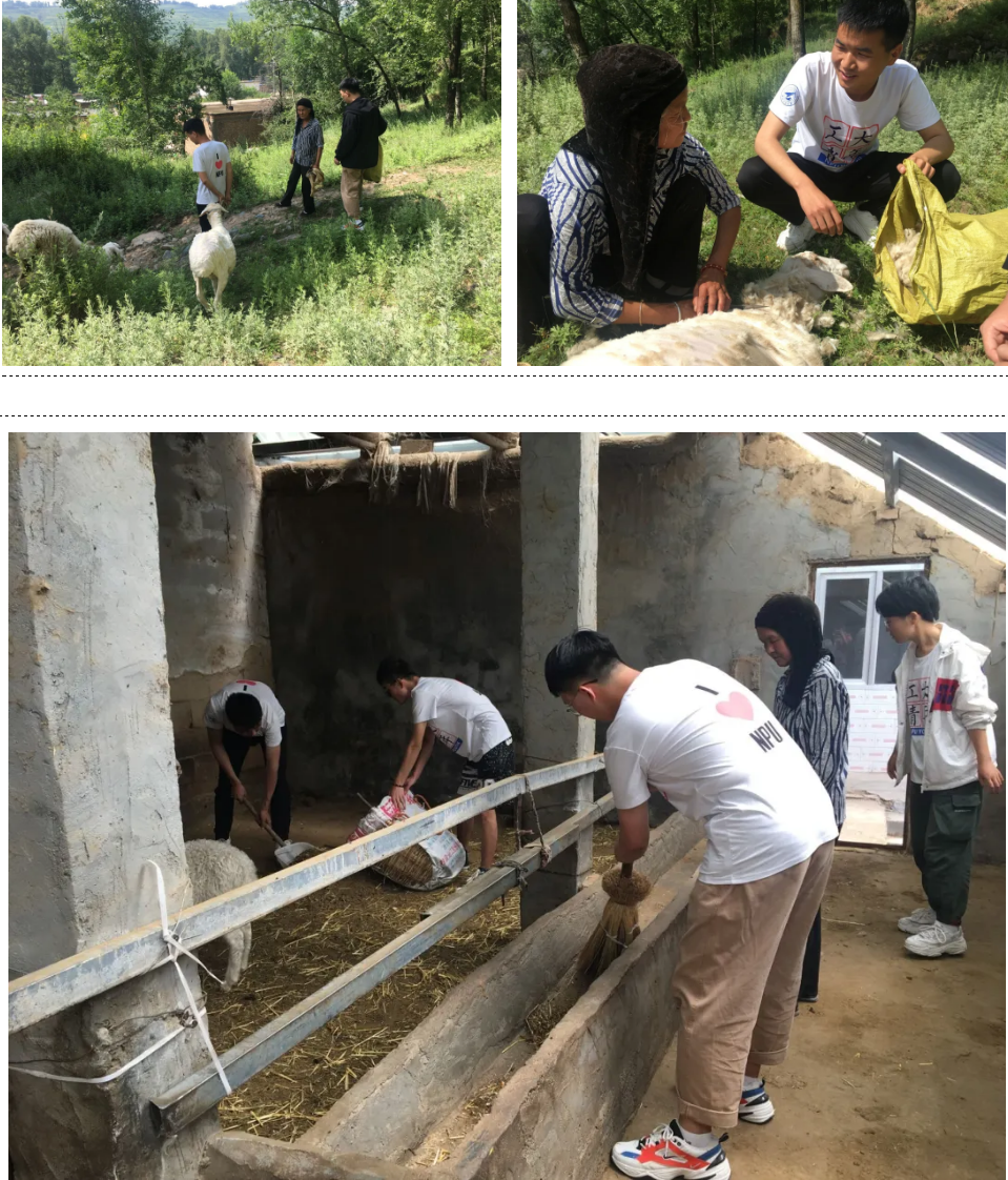 我们抵达冶奶奶家时正好看到奶奶在剪羊毛,于是两位男同学帮助奶奶抓羊、捡羊毛,再将山上的羊赶回羊圈。最后,我们帮奶奶清扫了羊圈。