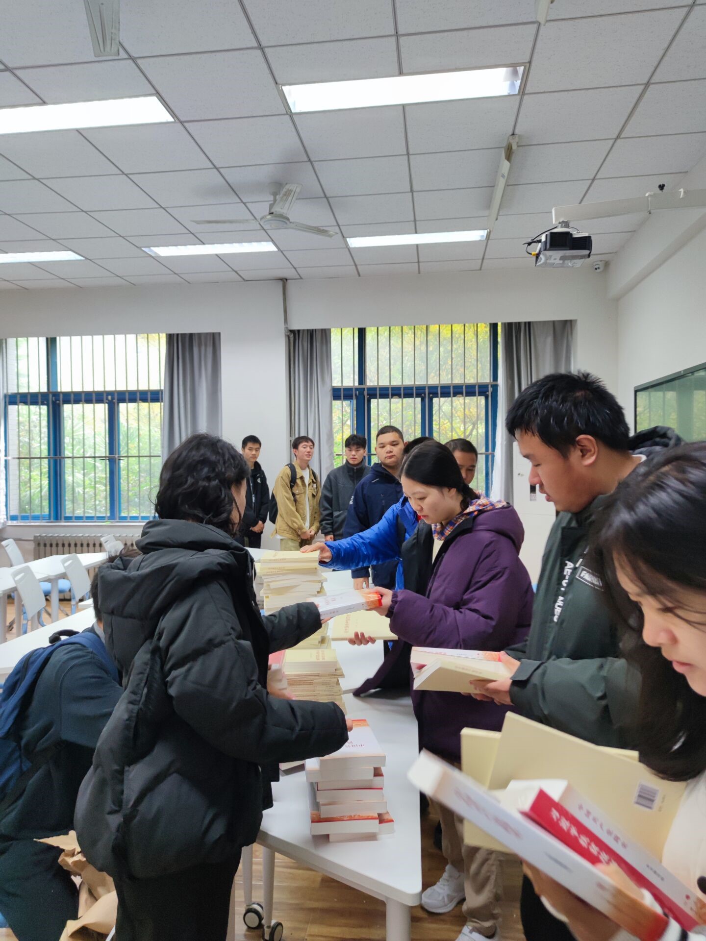 辅导员沙木哈尔、班主任魏晓冬、杨文琪、杨莉参加活动并为同学们分发书籍,书籍包括《论中国共产党历史》、《中国共产党简史》、《习近平新时代中国特色社会主义思想学习问答》、《习近平扶贫故事》等。