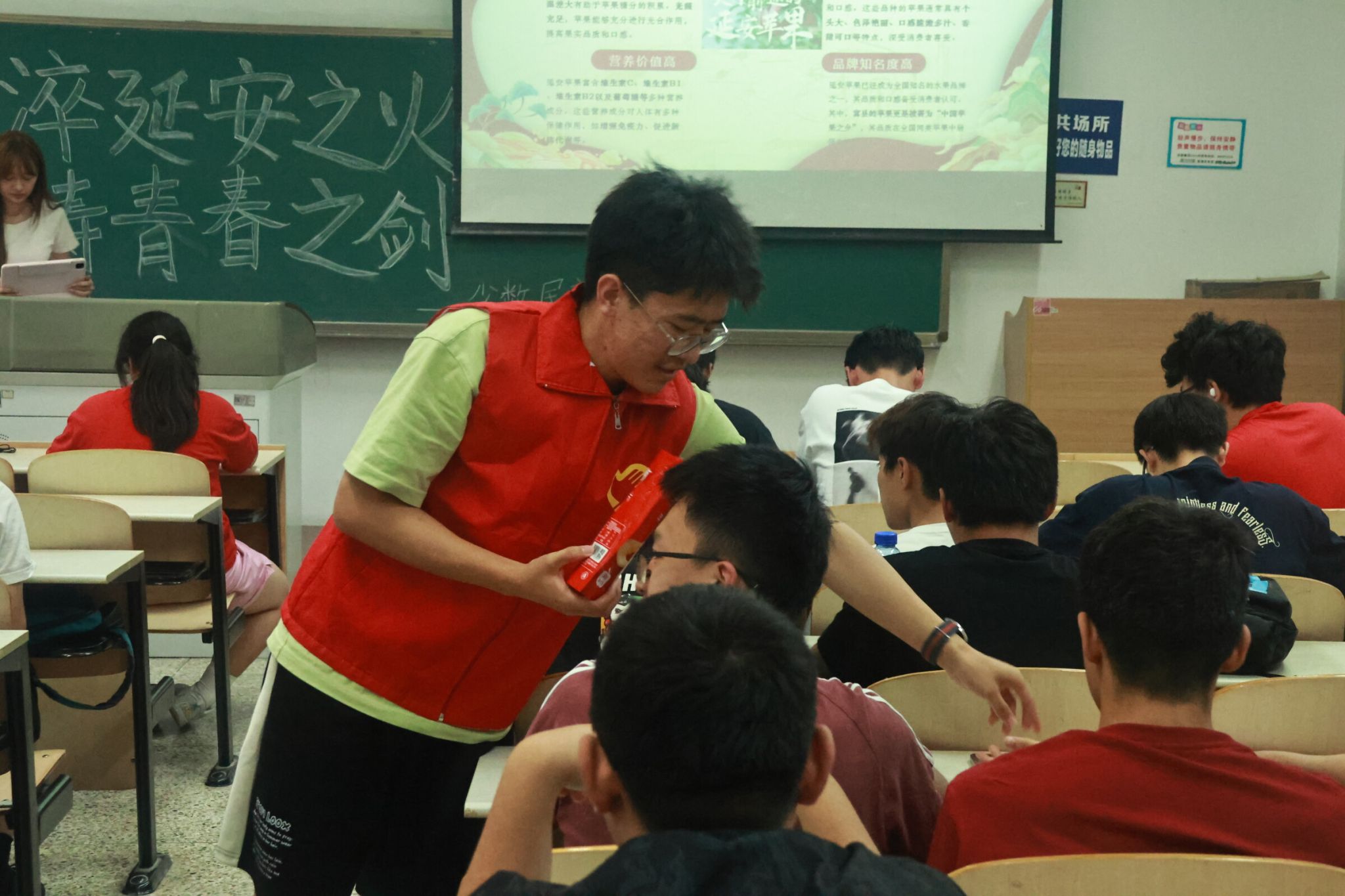 宣讲结束后,宣讲队的同学们采用视频介绍,有奖问答等多种互动形式,向同学们推介了延安苹果、小米、红枣等优质农特产品,助力乡村振兴。