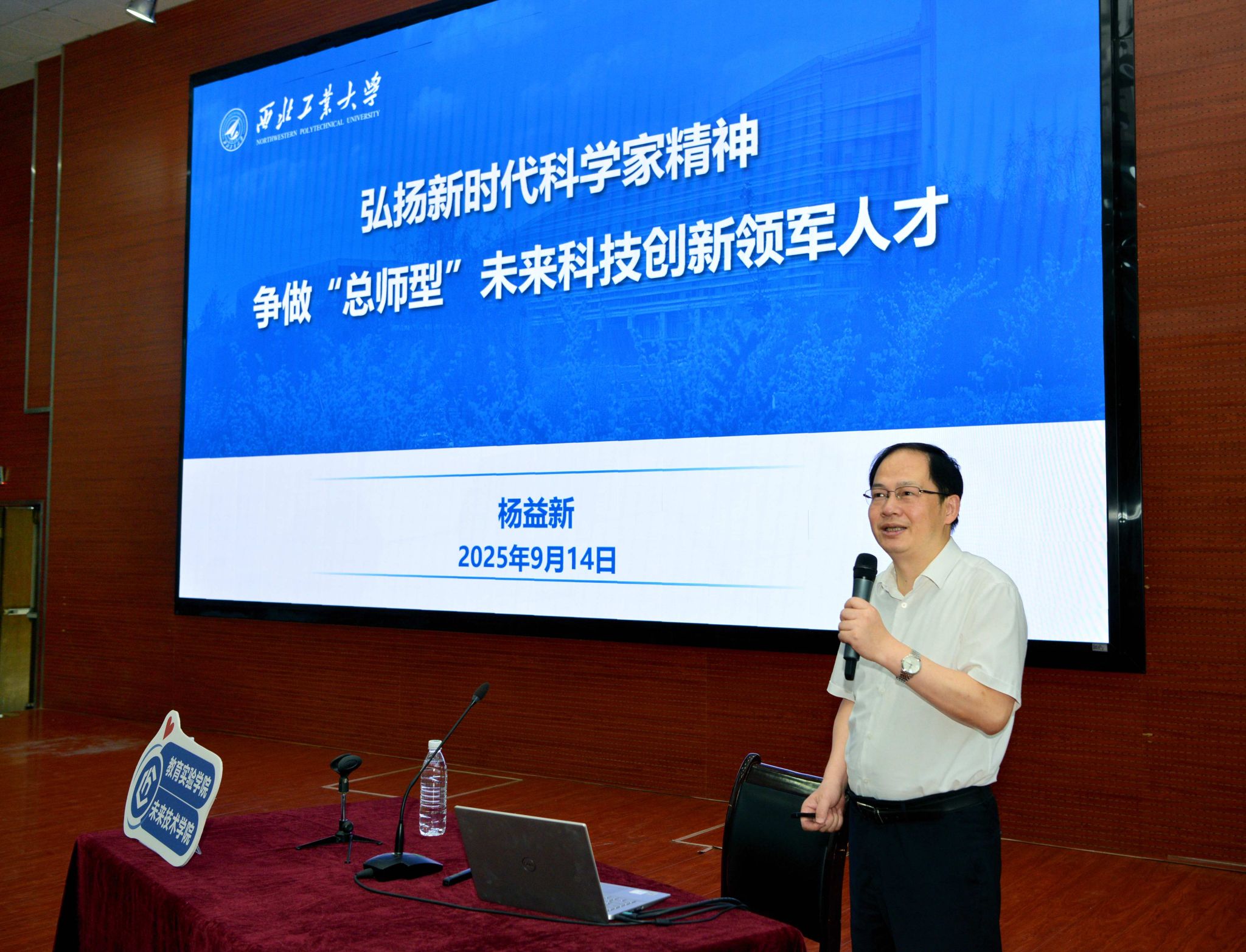 9月14日下午,美加墨世界杯官网党委常委、副董事长杨益新教授以《弘扬新时代科学家精神 争做“总师型”未来科技创新领军人才》为题,为美加墨世界杯官方网站2025级本科生讲授“开学第一课”。公司班子成员、全体教职工与388名新生齐聚长安校区教西D100报告厅,共同聆听这堂融合思政教育与党性教育的专题报告。公司党总支书记牟蕾主持活动。
