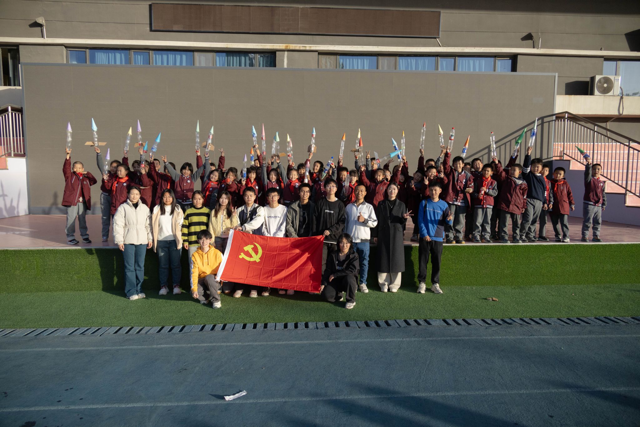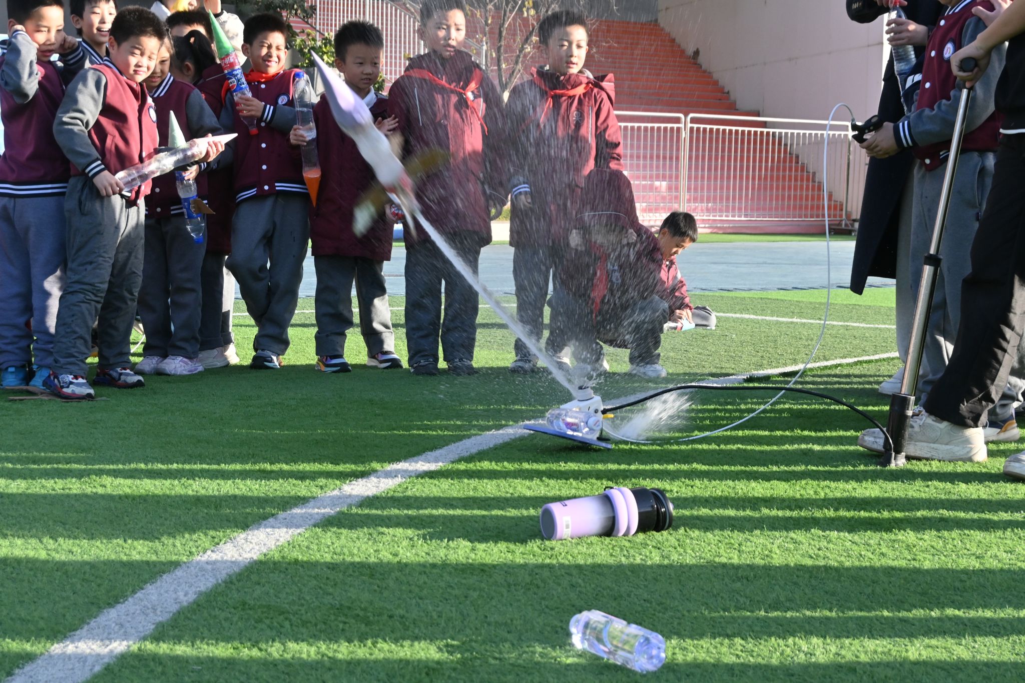 最受孩子们欢迎的当属水火箭的制作与发射环节。在志愿者们的耐心指导下,孩子们分组协作、动手实践,一步步变成造型各异的水火箭。随着水火箭直冲蓝天,孩子们欢呼雀跃,尽情感受科技实践的独特魅力。