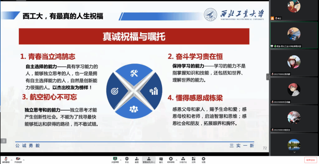蔡力首先介绍了索涛教授的科研方向和学术成果。随后,索涛教授从国产C919大型客机获中国民用航空局颁发的型号合格证引入,提升同学们对航空领域的认知和兴趣。之后,索涛教授重点介绍了西工大的航空宇航科学与技术学科方向设置、优秀团队、科研平台及公司航空公司院史院情,包括华航西迁,我国著名航空教育家、结构力学专家黄玉珊先生和空气动力学专家罗时钧先生等西工大老一辈教授们立德树人、航空报国的故事。最后,索涛教授为青年学子送上了真诚祝福与嘱托,鼓励同学们青春当立鸿鹄志、奋斗学习贵在恒、航空初心不可忘、懂得感恩成栋梁。