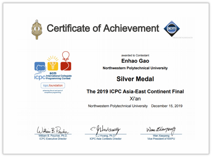 在大一修读C语言程序设计课程的过程中,高恩豪对算法竞赛产生了浓厚的兴趣,自此开始了他的竞赛之路。算法竞赛题目难度大,参与群体广,有不少参赛者在中学期间就已经打下了扎实的基础,取得了优异的成绩,这对从零开始的高恩豪来说挑战很大。在困难面前,他选择了迎难而上,将大量的课余时间投入到了算法竞赛当中,在程序设计基地教练的指导下,和队友制订合理的训练计划,按照计划刻苦练习,在一次次的冥思苦想,一次次的推翻重来,一次次的解决问题的过程中,锻炼了思维,磨练了意志,提升了能力。艰苦奋斗终有回报,他在多次参加算法竞赛的过程中收获了优异的成绩。