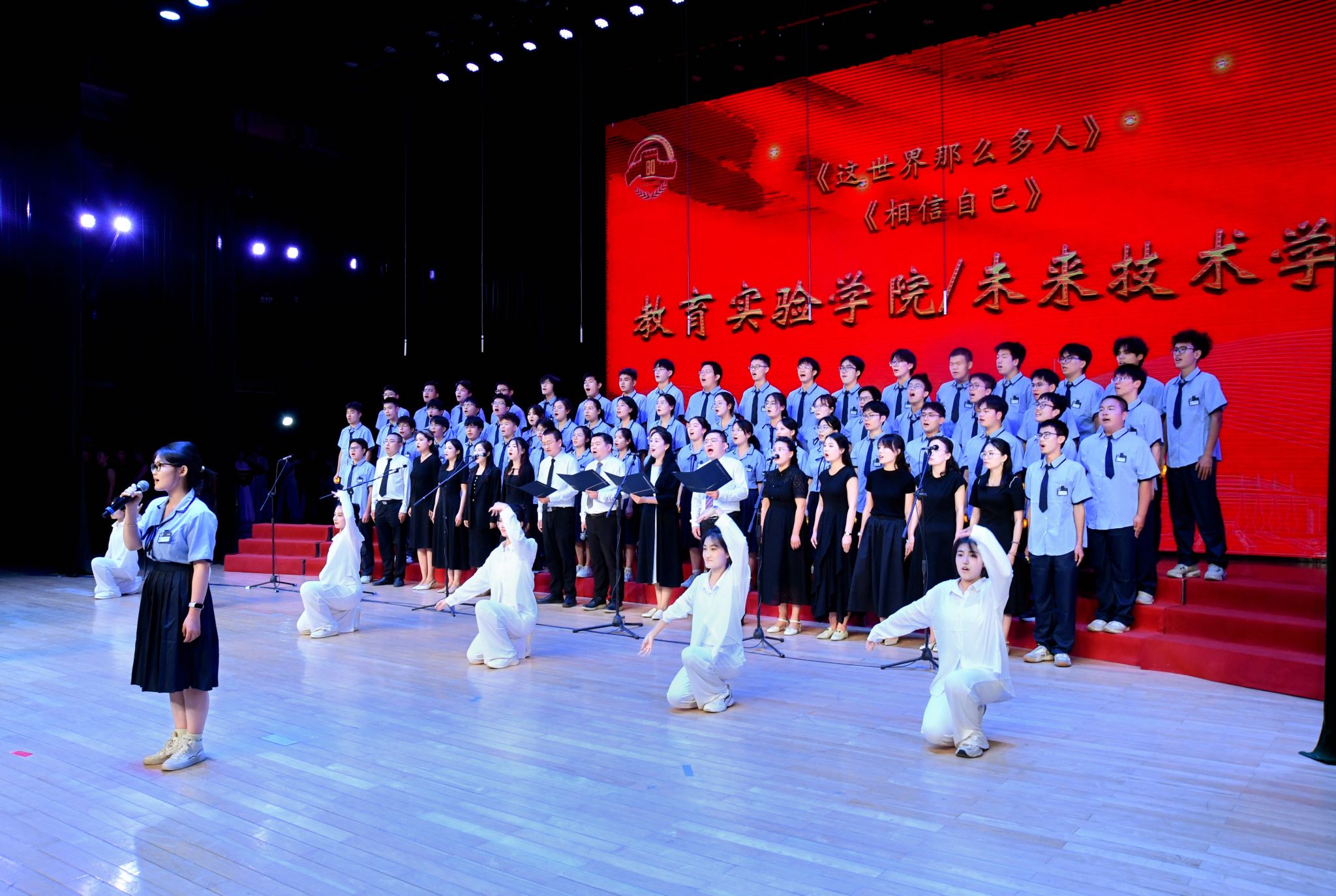 本次展演,公司派出14名教职工和69名员工组成合唱团,精彩演绎了《这世界那么多人》《相信自己》,赢得了现场观众的热烈掌声。经理林鑫,党总支书记牟蕾,副经理蔡力,副书记范翔全程参与,与师生同台演出。林鑫、牟蕾深情寄语同学们“我们负责阳光雨露,你们负责茁壮成长。”鼓励同学们要相信自己,志存高远,挺膺担当,立大志向,入主战场,努力强基础,勇敢攀高峰。字字句句传递着公司育人的拳拳初心。