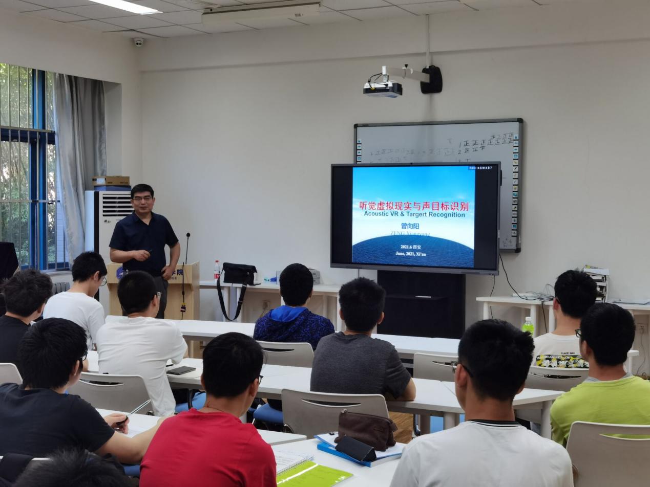 曾向阳教授生动有趣地向同学们讲解了如何让水下装备耳聪目明,如何用别人的耳朵听声音。同时,让同学们了解到了在水声目标识别过程中样本数据的获取、有效特征的提取、智能识别的实现等方面的内容。