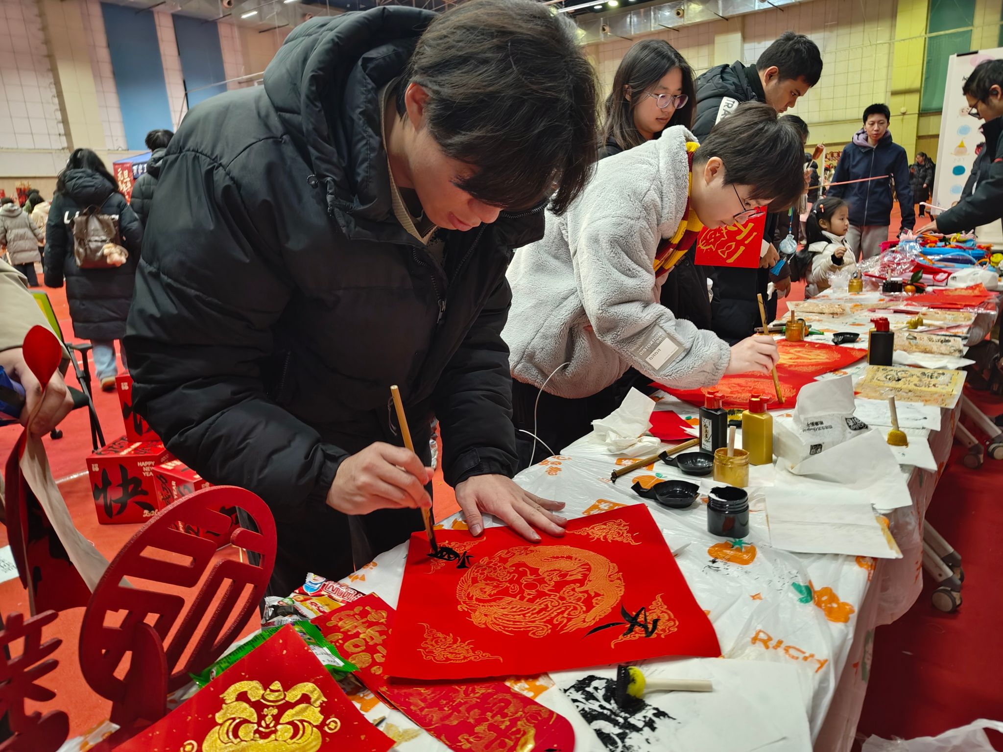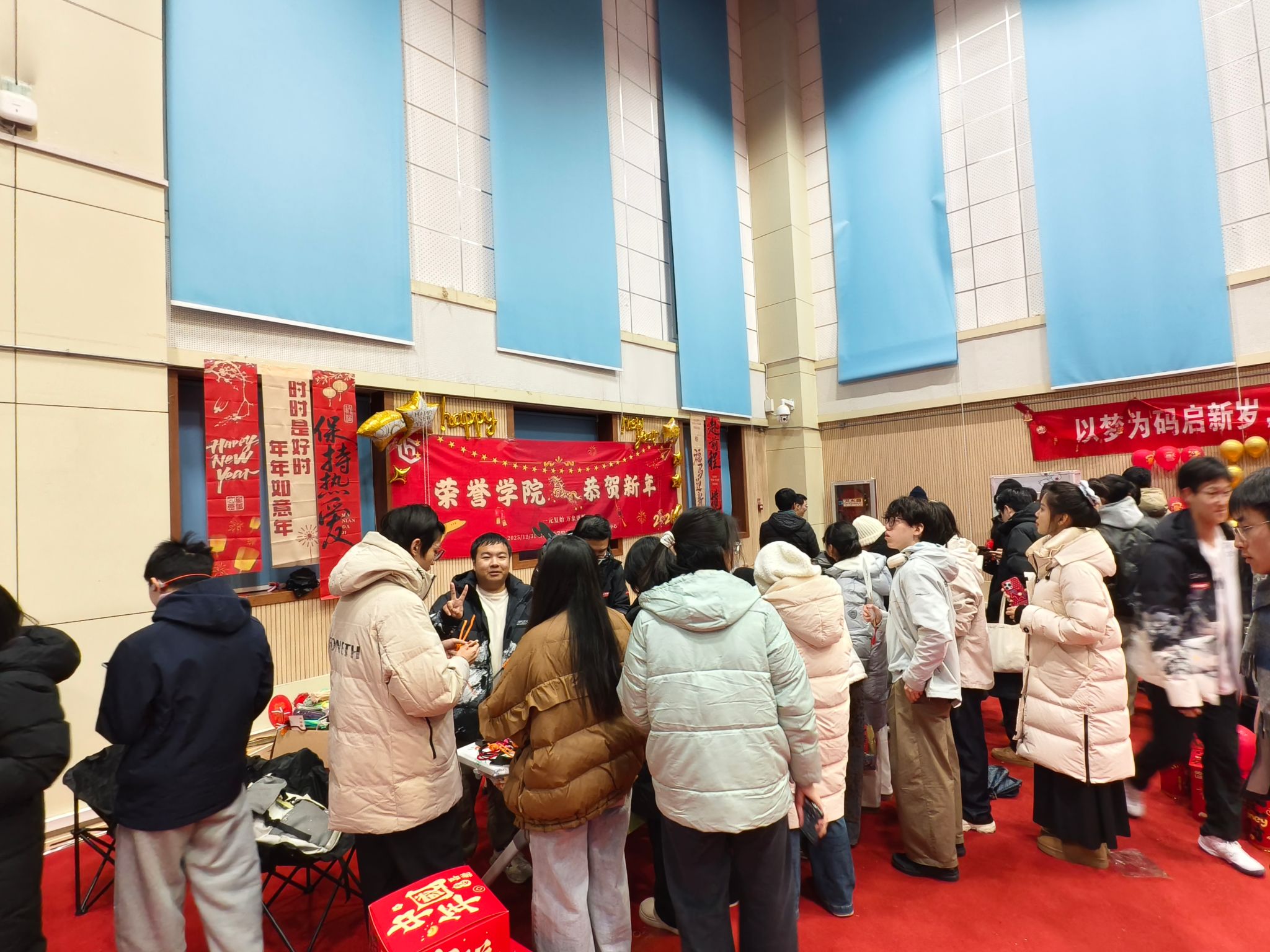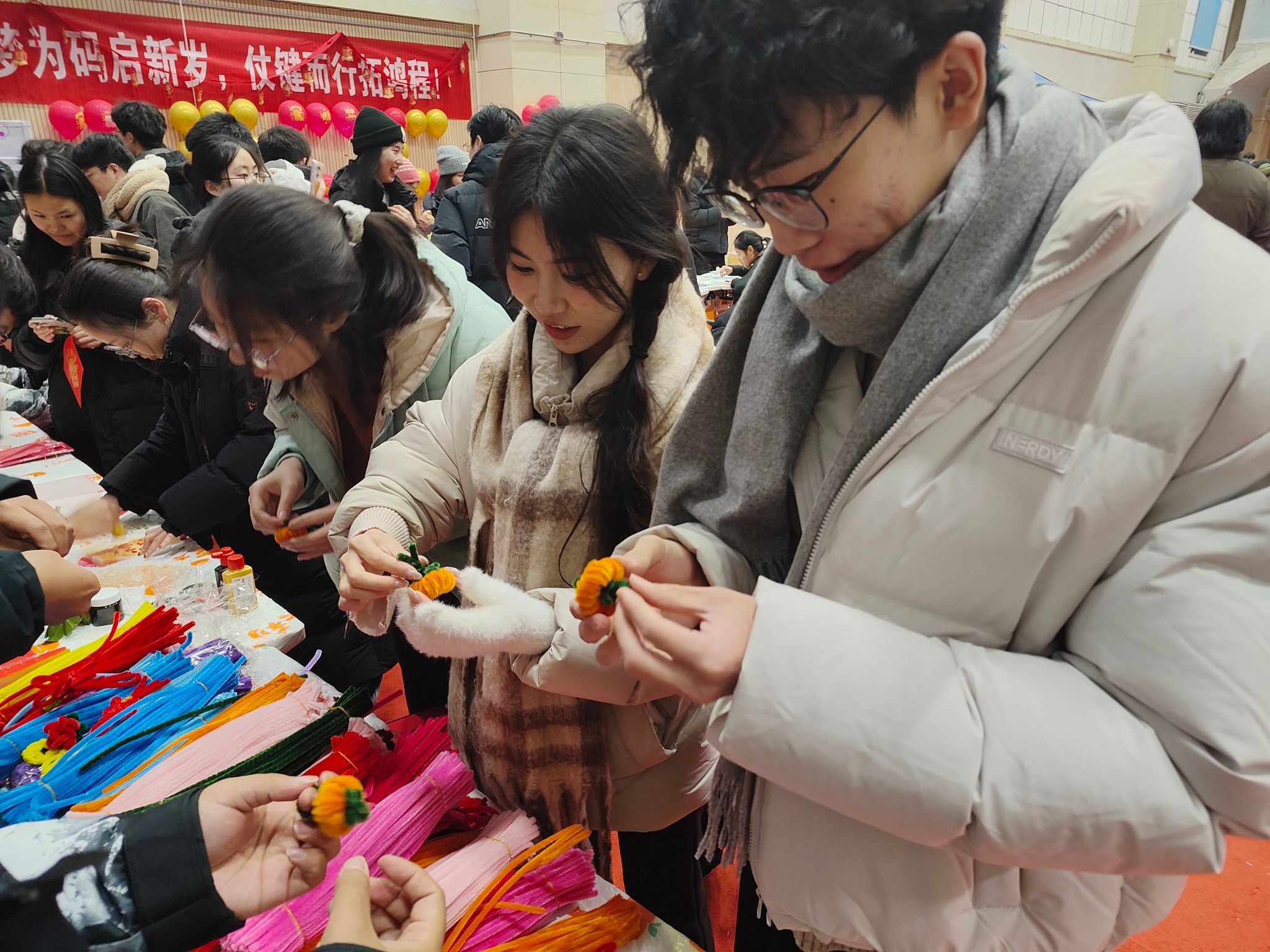 包饺子环节后,翱翔体育馆副馆内同样精彩纷呈,公司策划的元旦嘉年华热闹开场。“扭扭棒奇趣手作”让创意尽情绽放,色彩斑斓的扭扭棒在同学们手中变成萌趣玩偶、精致挂饰;“墨韵拓印坊”里,大家亲手体验传统拓印技艺,在笔墨书香中感受传统文化的厚重;“欢唱麦霸赛” 上,学子们放声高歌,用旋律诉说青春心事;“奥利奥挑战” 等趣味游戏则让现场笑声不断,热闹非凡。参与活动可兑换定制硬币,用于“萌宠抓捕大作战”,专注的眼神、成功的欢呼、互助的鼓励,勾勒出一幅青春洋溢、活力满满的校园画卷。