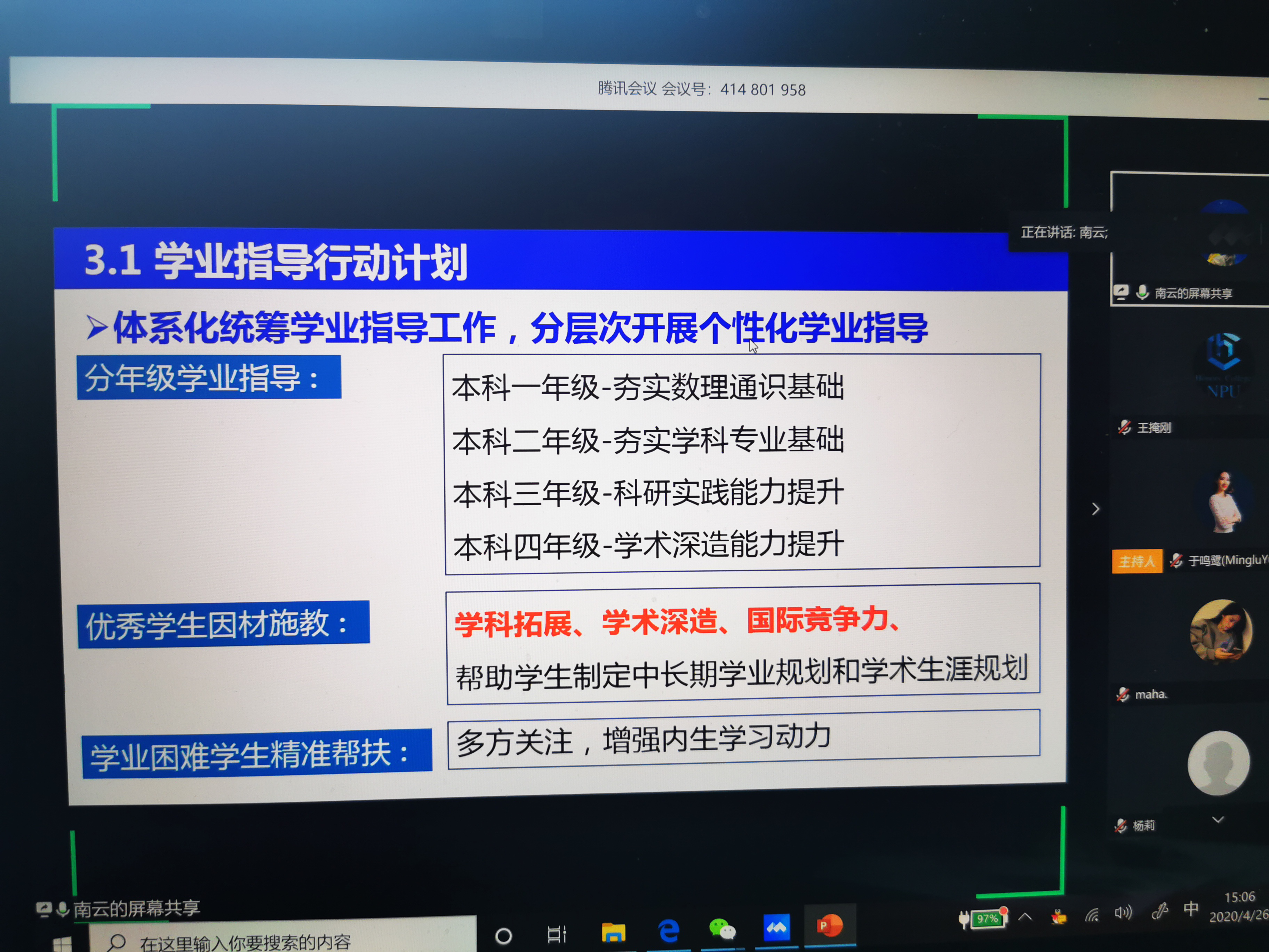 2020年4月26下午,美加墨世界杯官方网站通过腾讯会议平台在线召开学业指导研讨会暨姚如贵老师欢送会。美加墨世界杯官方网站经理王掩刚、党总支书记张文涛及全体教职工参加,会议由王掩刚经理主持。