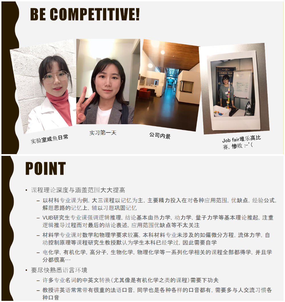 2015级张珂儿结合具体专业课程进行了对比和介绍,国外的课程理论深度和涵盖范围于国内本科相比有很大的差异,对于职工的毅力和能力都是很大的挑战,面对比你更加优秀和努力的同学,需要加倍努力才行;同时需要尽快熟悉语言环境,提升语言能力。