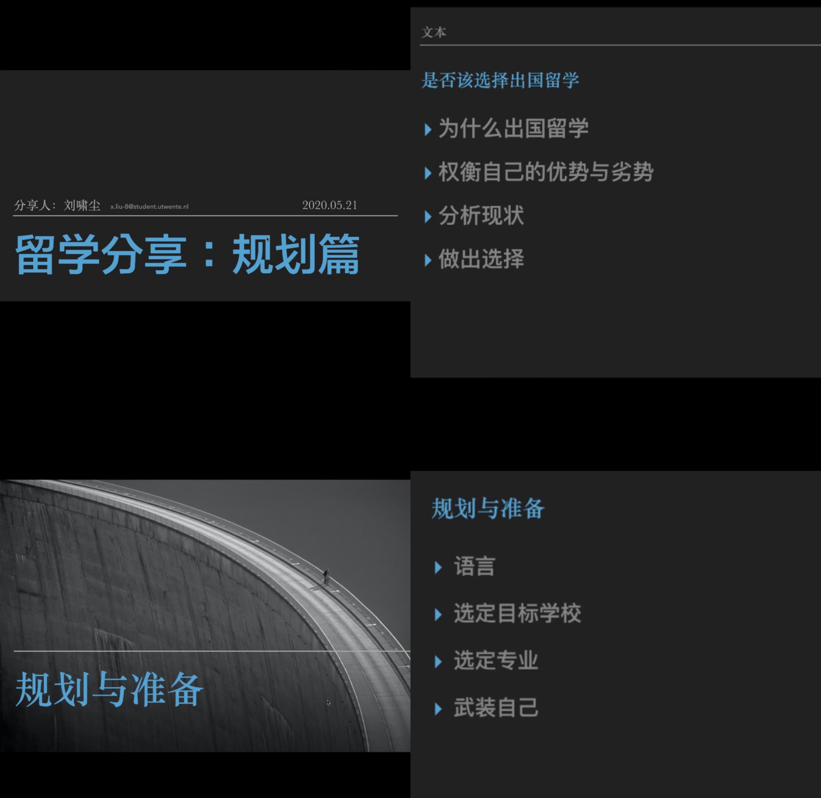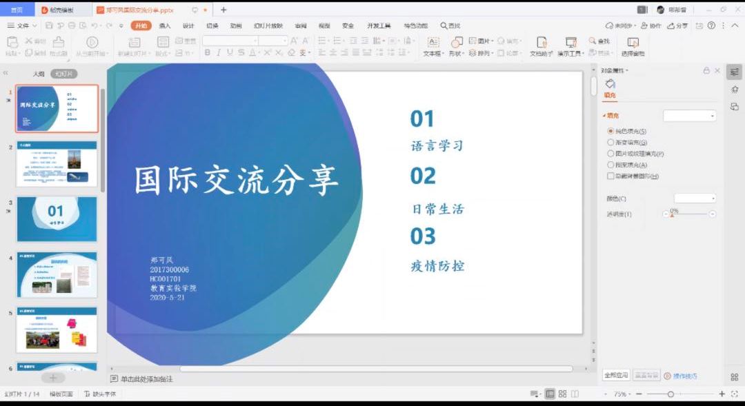 2017级郑可风重点围绕留学的语言学习方面、日常学习生活进行了分享。针对语言学习,要多交流和沟通,通过参加各类活动来快速提升语言能力。面对不同的学习生活节奏,还需要做好自我管理和时间管理,通过自学等方式弥补专业知识短板。