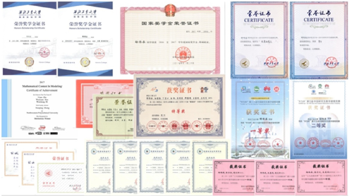 (邸伟承在校期间所获部分荣誉奖项证书)