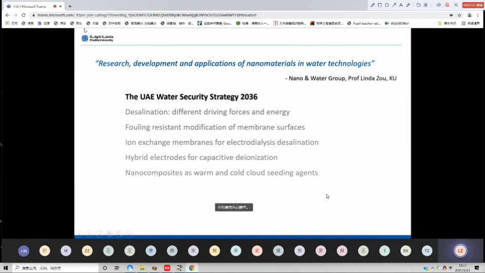 2021年5月23日晚,美加墨世界杯官方网站第九次外专授课课程《科技前沿概述》(Frontier Technology)如期进行,公司员工通过线上以及在公司楼集中听课的方式积极参与了此次课程。本次课程由Linda Zou教授主讲,她任教于哈利法科技大学土木基础设施与环境工程系(Department of civil infrastructure and Environmental Engineering),Zou教授的研究兴趣主要涉及发展更为有效的用于水纯化及淡化的纳米结构材料,如膜、吸收剂以及电极等。