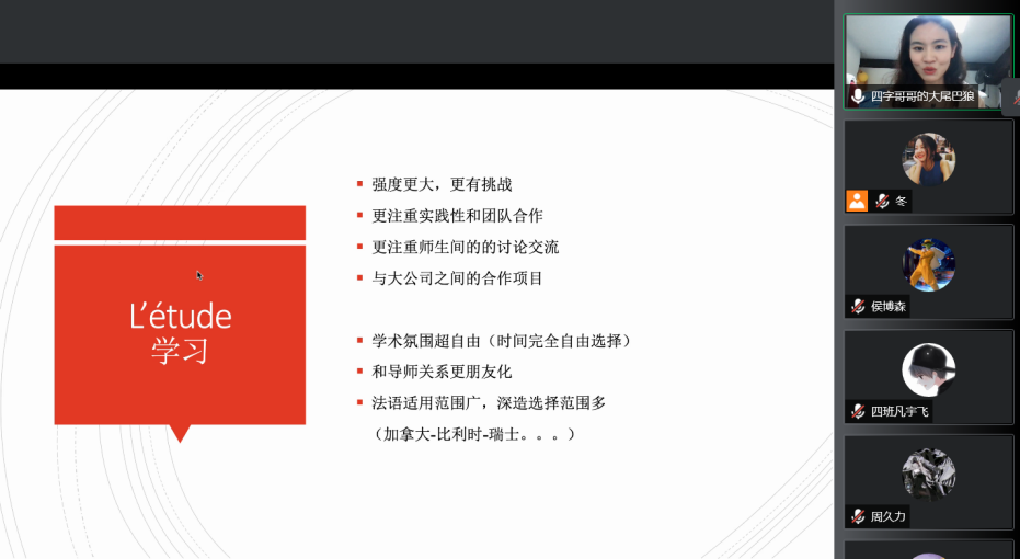 分享会伊始,魏晓冬老师首先介绍了法国INSA“3+2”本硕连读项目的概况、申请和选拔条件等,使大家进一步了解项目的内容。接着,赵涵逸同学为大家分享了自己目前在法国的学习和日常生活,讲述了在法国的不同经历和感受,生动的描绘让在会的每个同学都对在法的留学生活产生了向往。