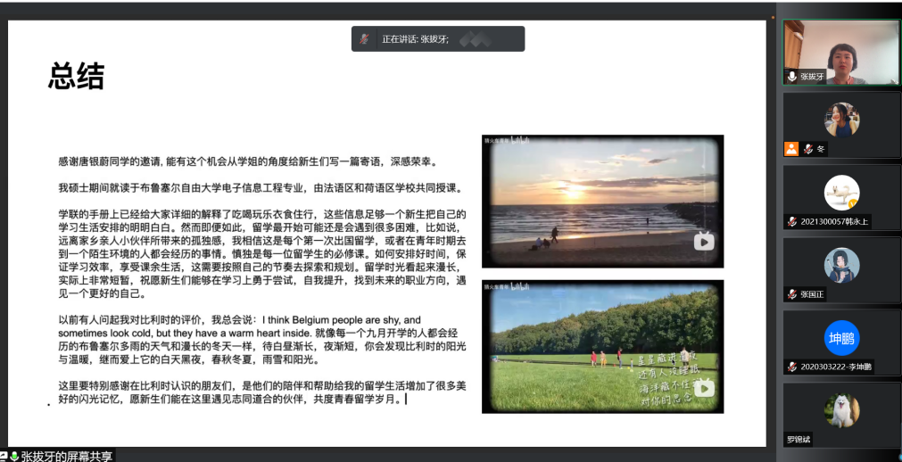公司国际化秘书魏晓冬老师简要介绍了自己到布鲁塞尔自由大学的学习交流经历。她通过分享交流期间的照片,讲解了自己的收获和心得。最后,魏老师向同学们介绍了公司的资助政策,并鼓励同学们抓住机会,积极争取海外学习交流的机会。