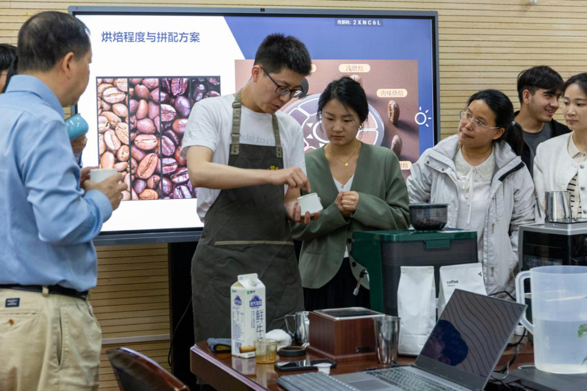 互动环节中,培训老师现场教授手冲咖啡和意式咖啡的制作技巧。大家积极提问、相互交流、亲手实践,从咖啡的色、香、味和制作等方面交流心得感悟。一杯杯浓香的咖啡,一阵阵欢声笑语萦绕会场,气氛轻松愉快。