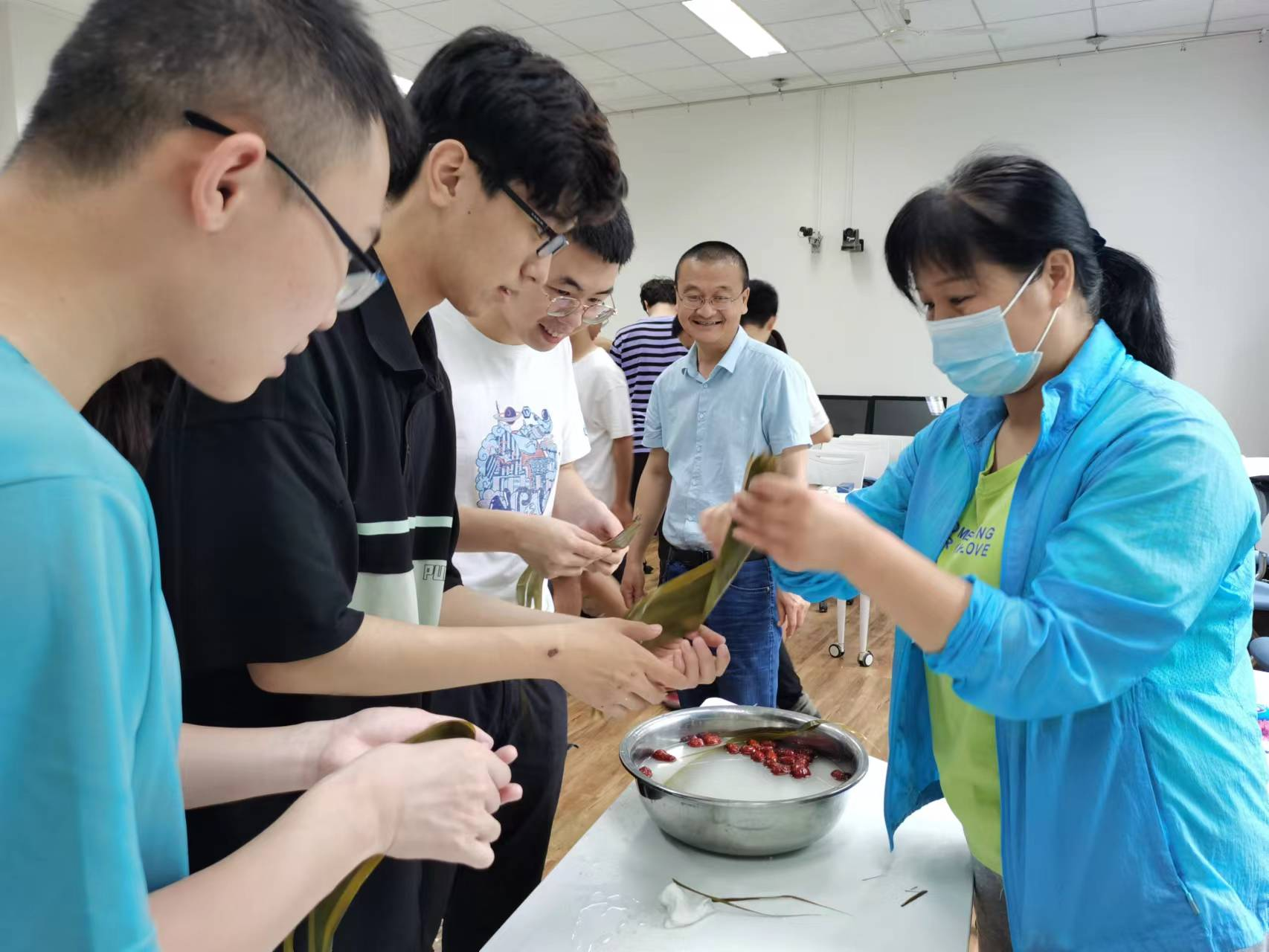 接着在“一笑向杯盘”的祝福声中,包粽子活动愉快地开始了。公司“楼管阿姨”姜凤婵从卷粽叶、如何包扎粽叶等方面为在场师生做了详细的讲解与示范。