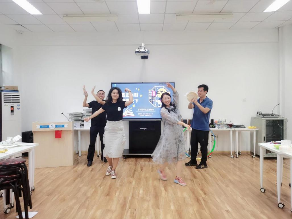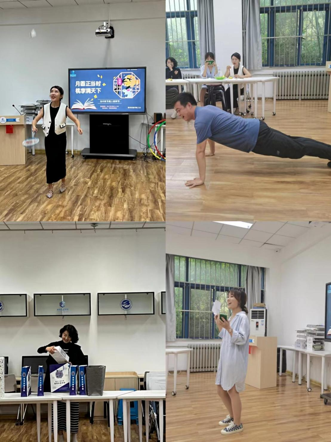 游戏互动环节,呼啦圈、俯卧撑、绕口令、唱歌、跳舞、跳绳、踢毽子、颠羽毛球......每位老师根据自己不同的任务卡完成指定的游戏任务,一项项活动有序开展,加油呐喊声、激情欢呼声此起彼伏。在轻松愉悦的氛围中,老师们散发出无尽的青春与活力。