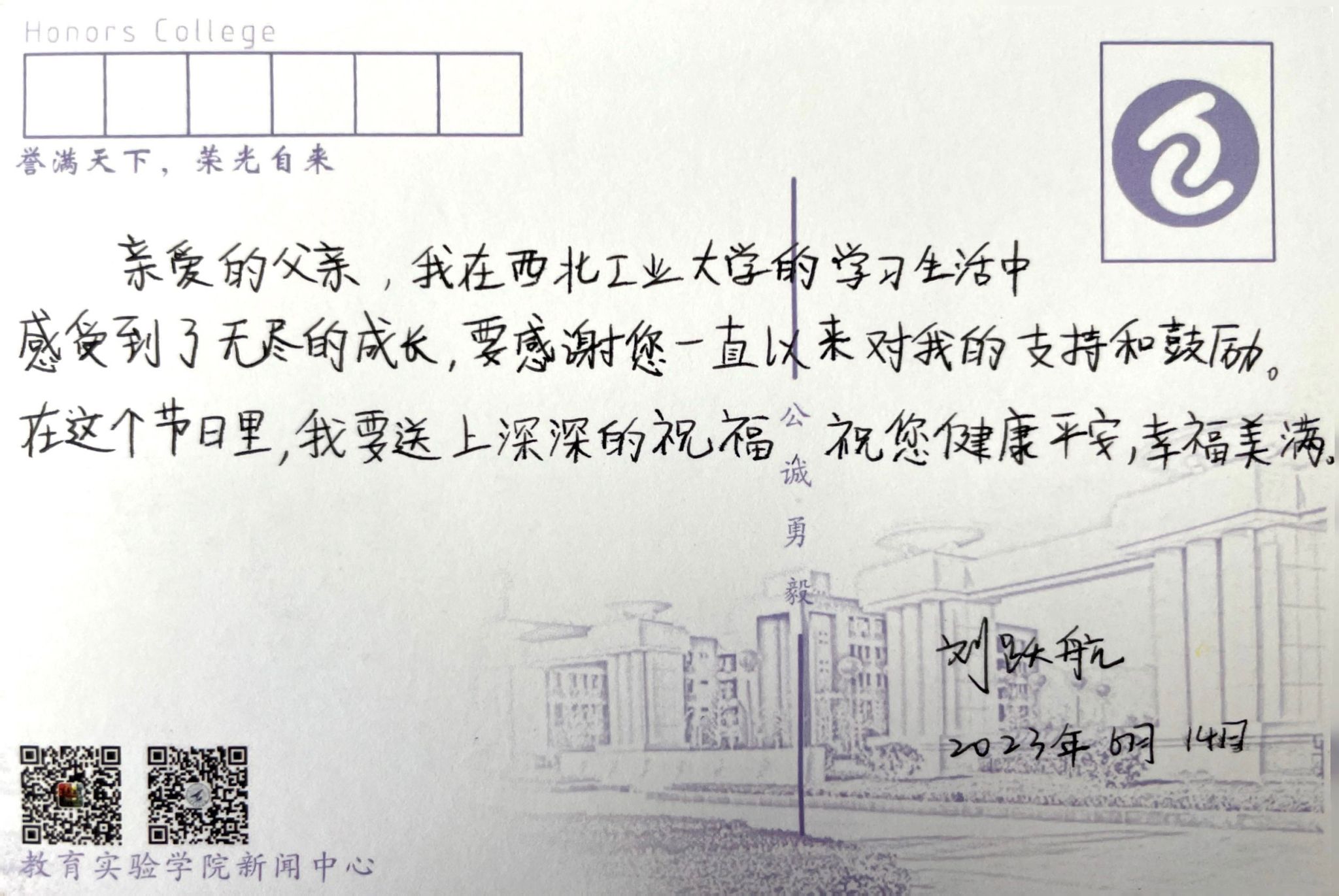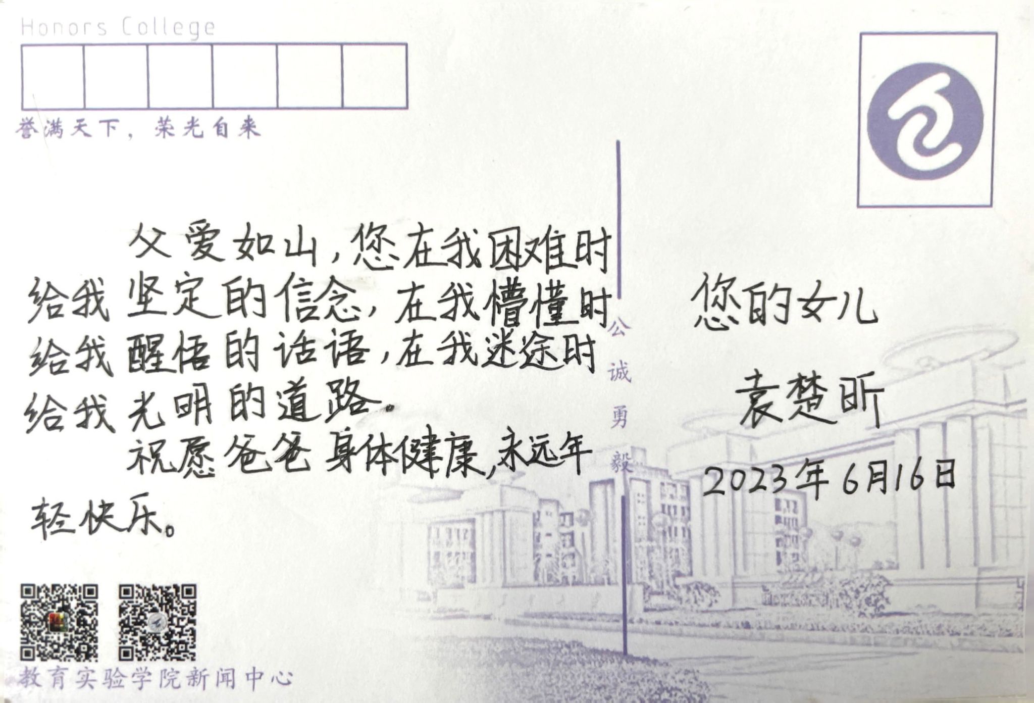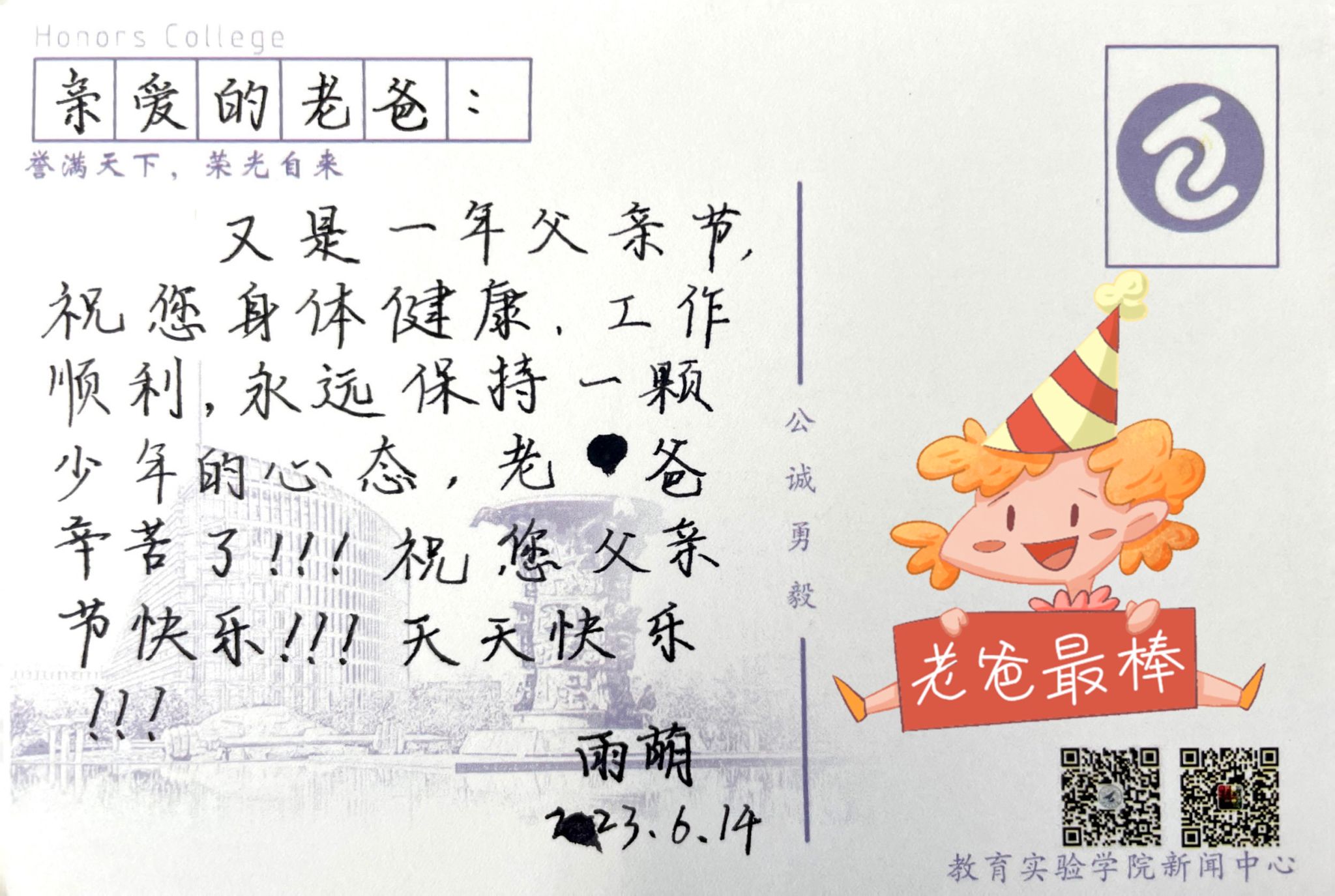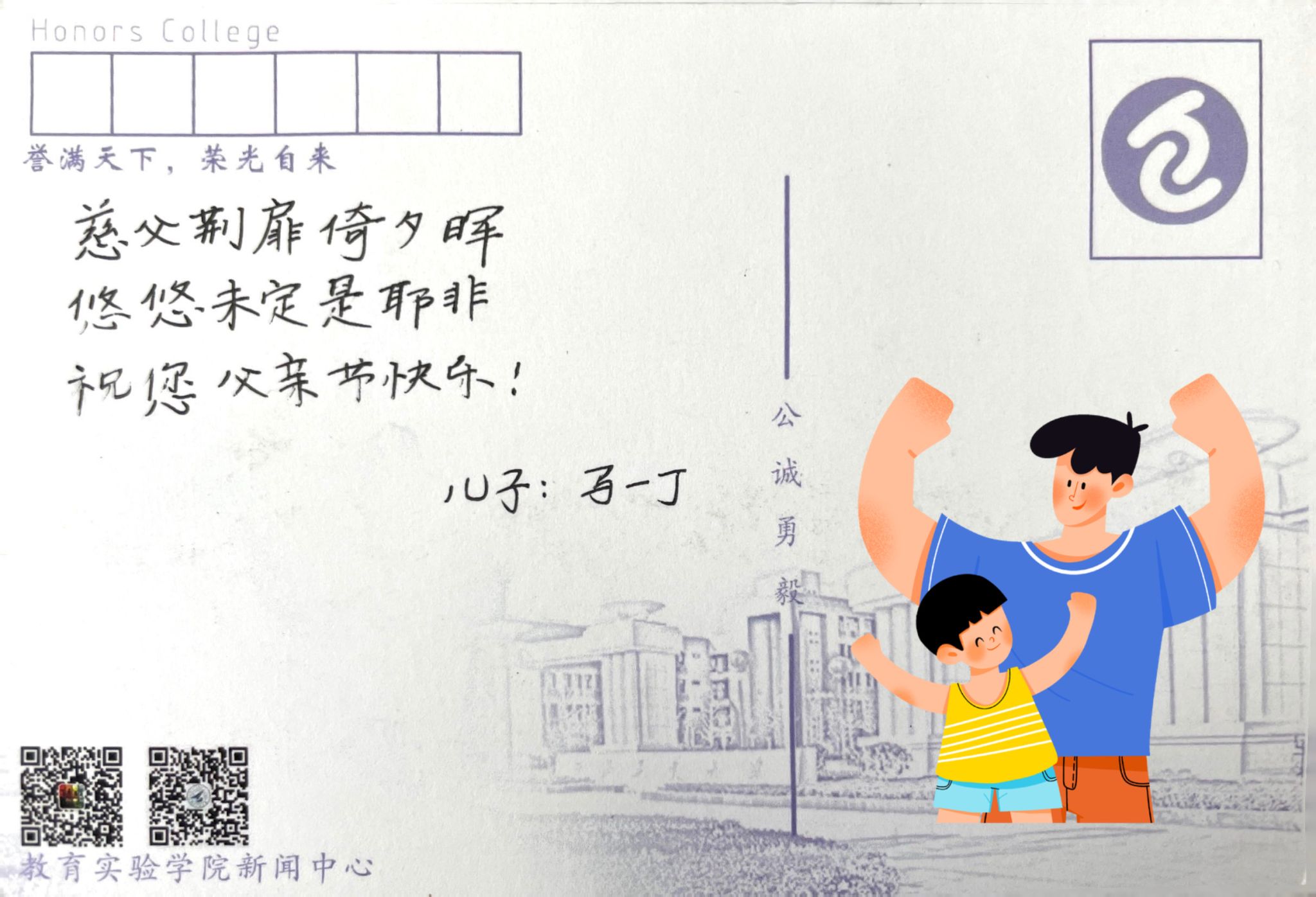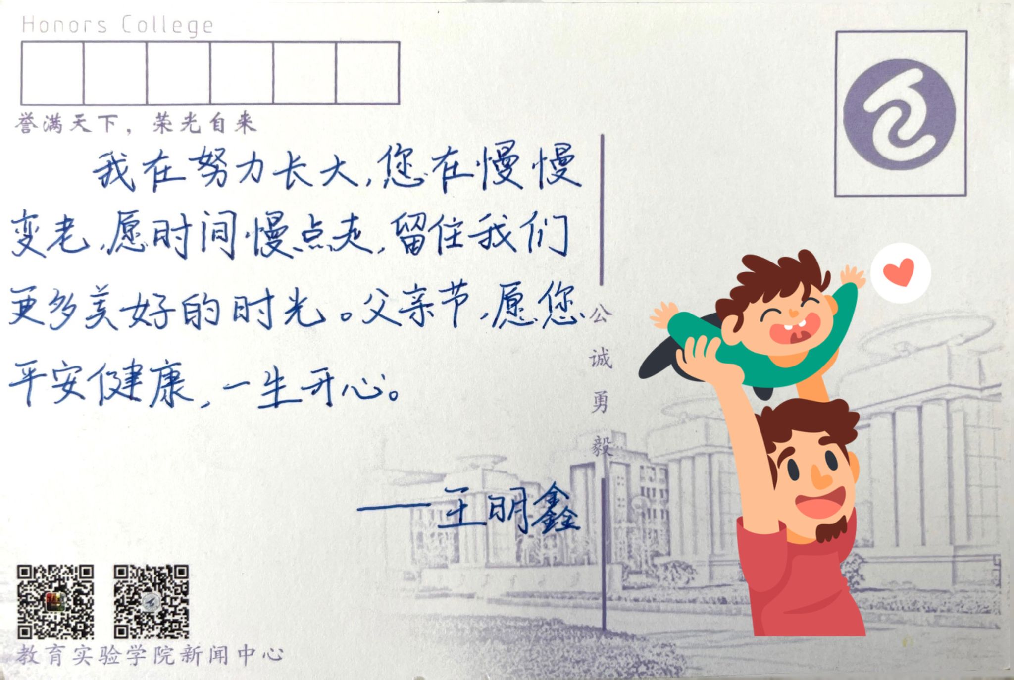 父亲,节日快乐。也许我写不出什么华丽的词藻,但我想说,如若多年后我成为一名父亲,我会努力让我的孩子也能由衷地写下这样一段话。您永远是我心目中最高大的人。